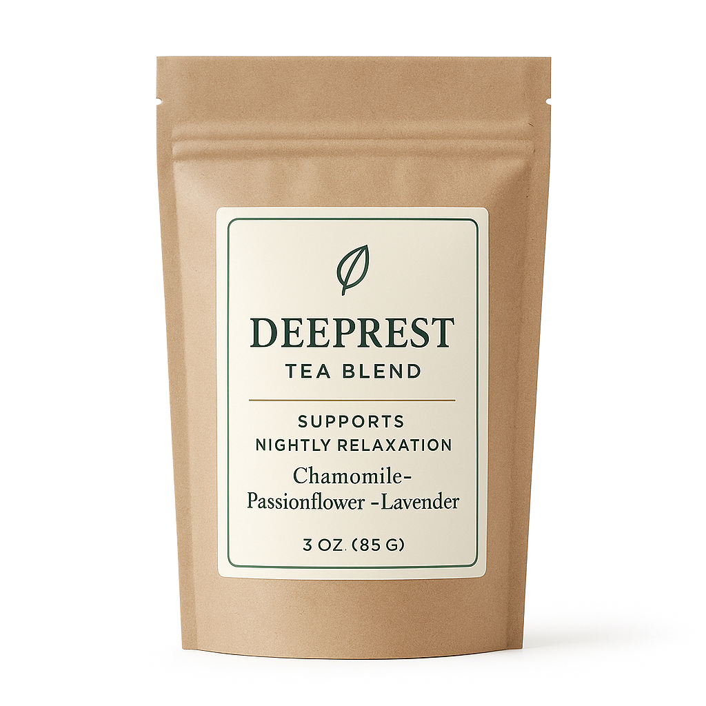 DeepRest Tea Blend is a calming, caffeine-free herbal infusion carefully crafted to help you unwind and drift into deep, natural sleep. This soothing nighttime blend combines chamomile, valerian root, lavender, passionflower, and lemon balm — herbs traditionally known to ease tension, quiet the mind, and relax the body before bedtime.